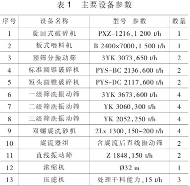 礦山原料經旋回式破碎機進行粗破后進入中間料堆棚儲存,然后輸送石灰石預篩分車間,預篩分后大于 31.5 mm 的物料喂入標準圓錐破碎機進行中碎;4.75~31.5 mm 的物料與中碎后的物料一起送骨料篩洗車間進行一級篩洗。當原料中含土量較少時,預篩分后小于 4.75 mm 的物料也送篩洗車間進行篩洗。 當原料中含土量較多時,小于 4.75mm 的物料輸送含土廢料堆棚儲存, 然后用于礦山開采后的復墾墊層。旋回式破碎機、預篩分振動篩、圓錐式破碎機及物料轉運點均設有高效袋收塵器進行除塵。