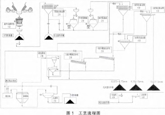 來自預篩分和中細破車間的物料通過一級篩洗振動篩篩洗后,大于 31.5 mm 的物料返回中細碎車間再此破碎。小于 4.75 mm 的物料隨洗石廢水一起 送 入 水 洗 砂 車 間 的 雙 螺 旋 洗 砂 機 進 行 洗砂 。4.75~31.5 mm 的骨料輸送二三級成品振動篩進一步篩洗。 經過二三級篩洗后的 15~31.5 mm 和4.75~15 mm 骨料送各自的成品 堆場 。篩下的小于 4.75 mm 的含泥細粉隨洗石廢水也一起送入水洗砂車間的雙螺旋洗砂機進行洗砂。