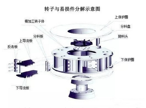 1)轉(zhuǎn)子中的拋料頭尖塊磨損板的不均勻磨損 (偏上或偏下) 大都是由于料板的角度不合理引起的;有時是由于破碎積料過多造成的。